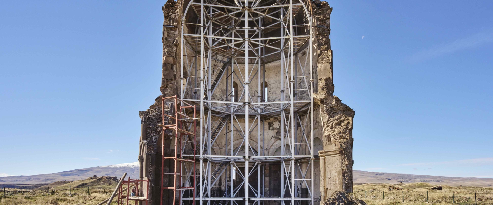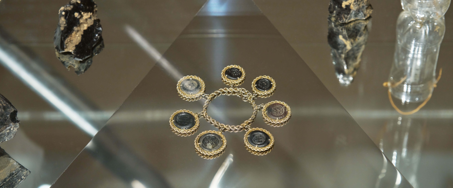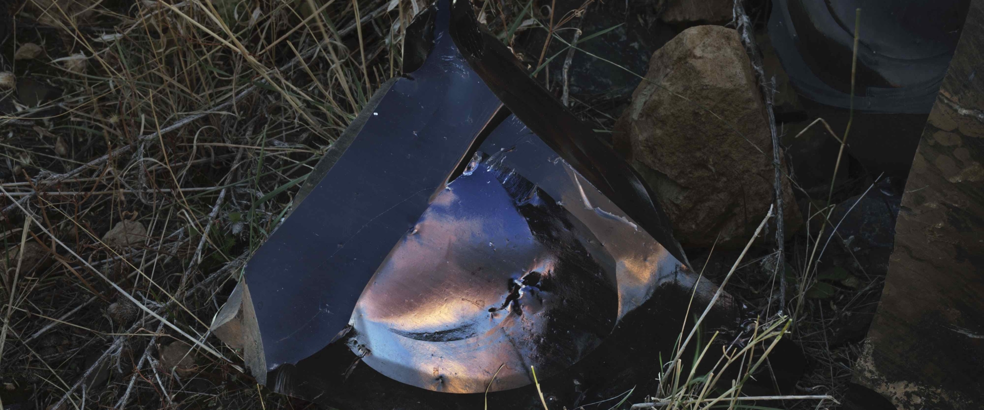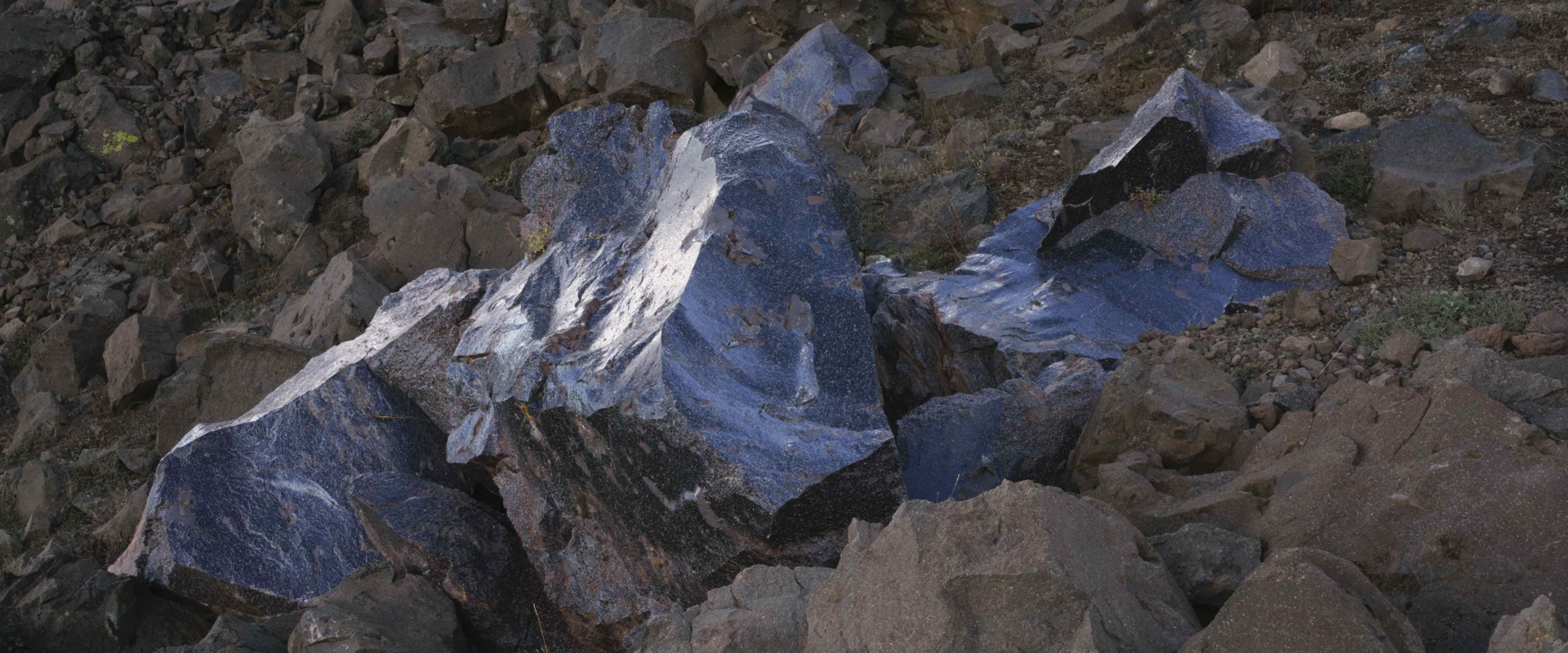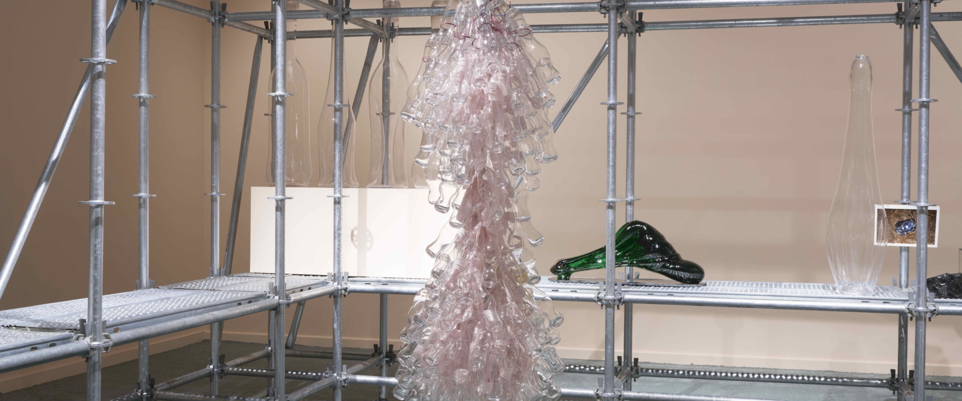 Historical glass objects, archaeological finds, found materials, and handwoven cords rooted in nomadic traditions are displayed within a scaffold structure built into the gallery space. This constellation, alongside photographs by Swedish photographer Peo Olsson documenting the artist’s research into obsidian fields in Bitlis, Van, and Kars, invites us to reverse our vertical perception of time.