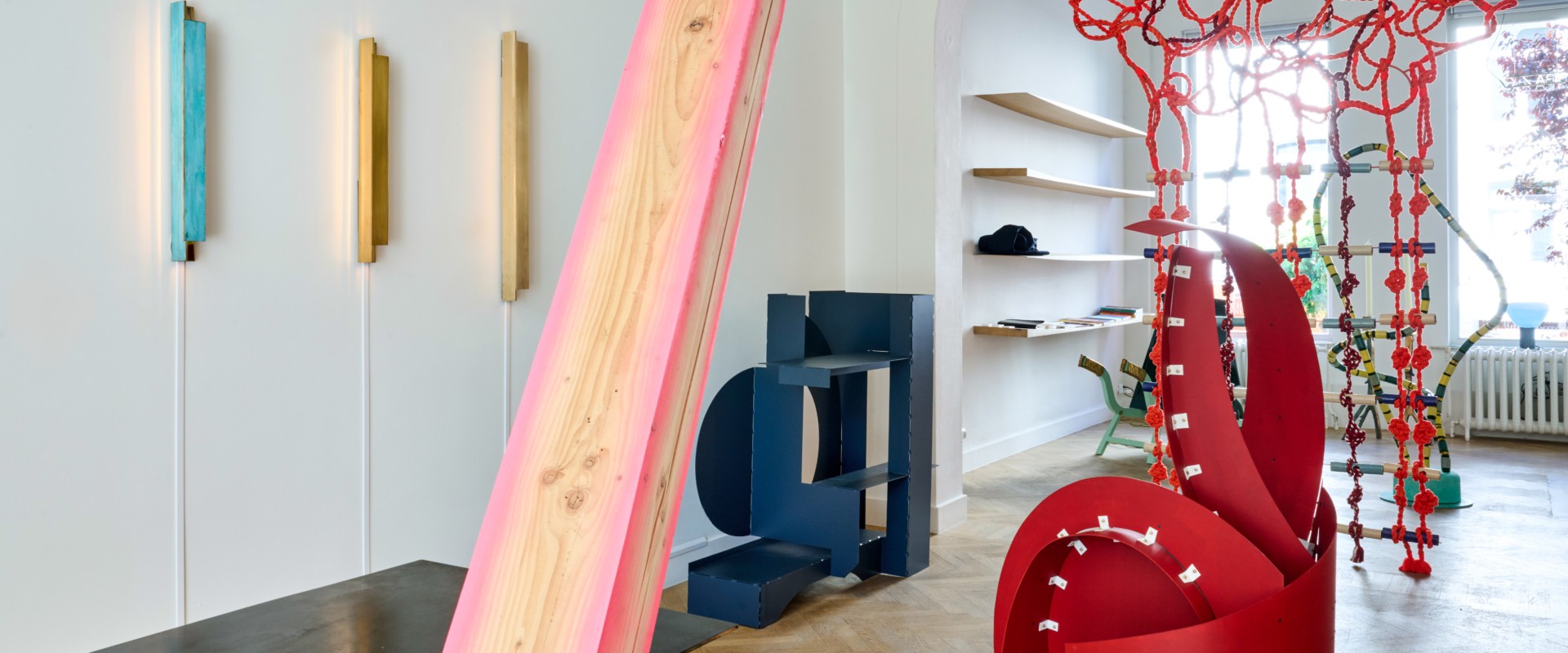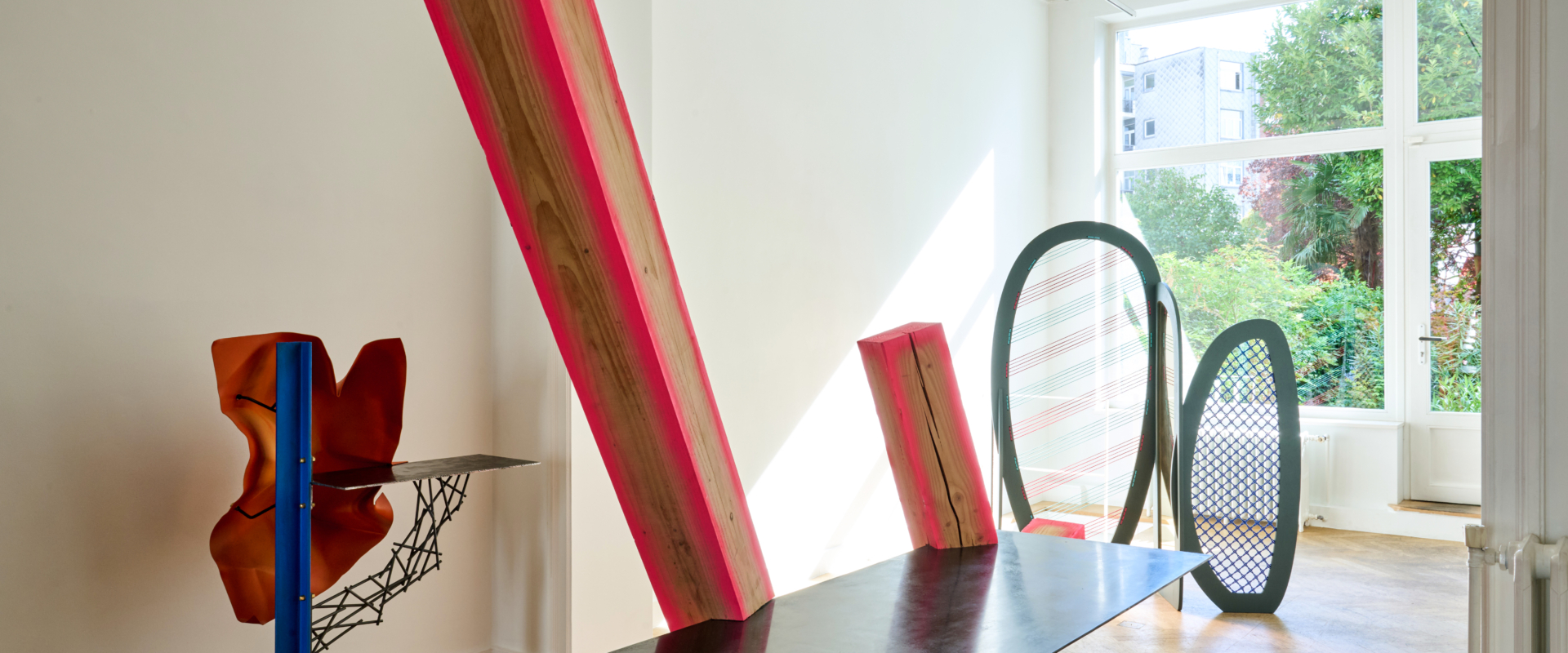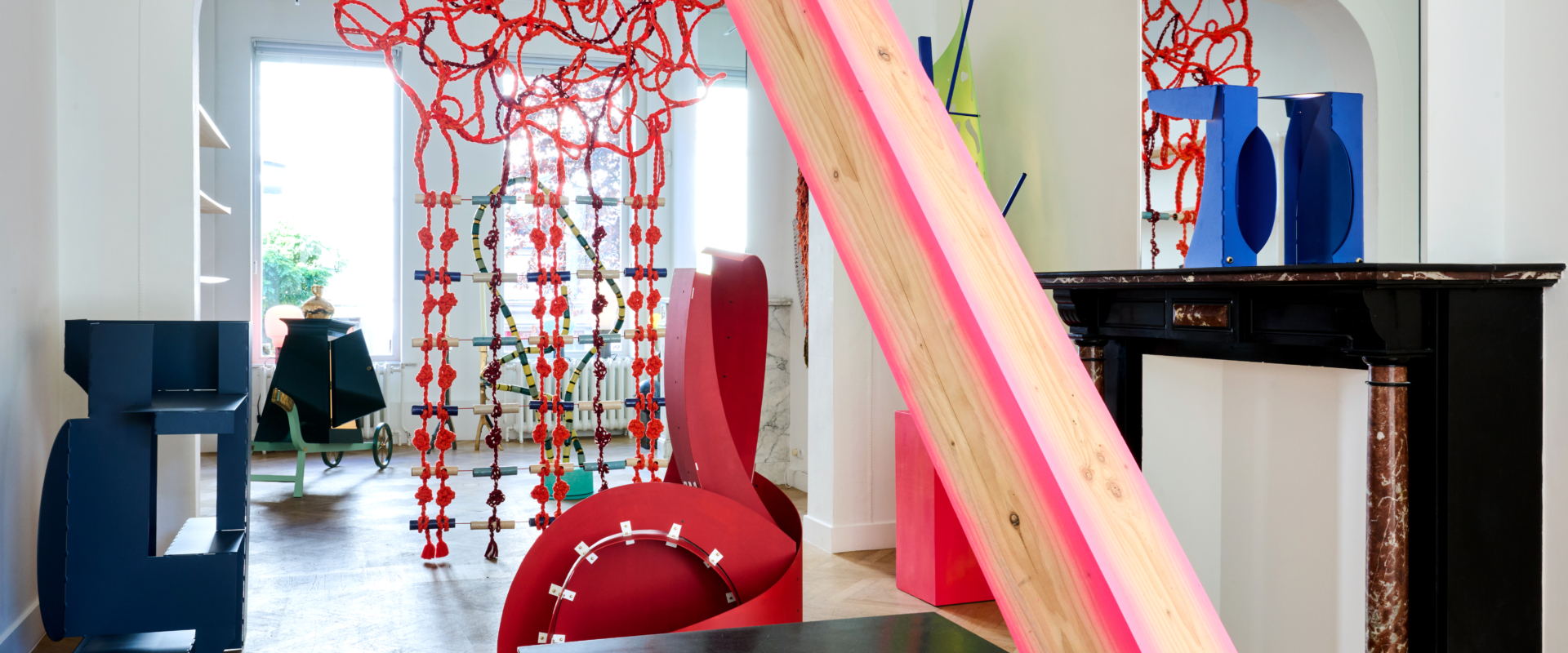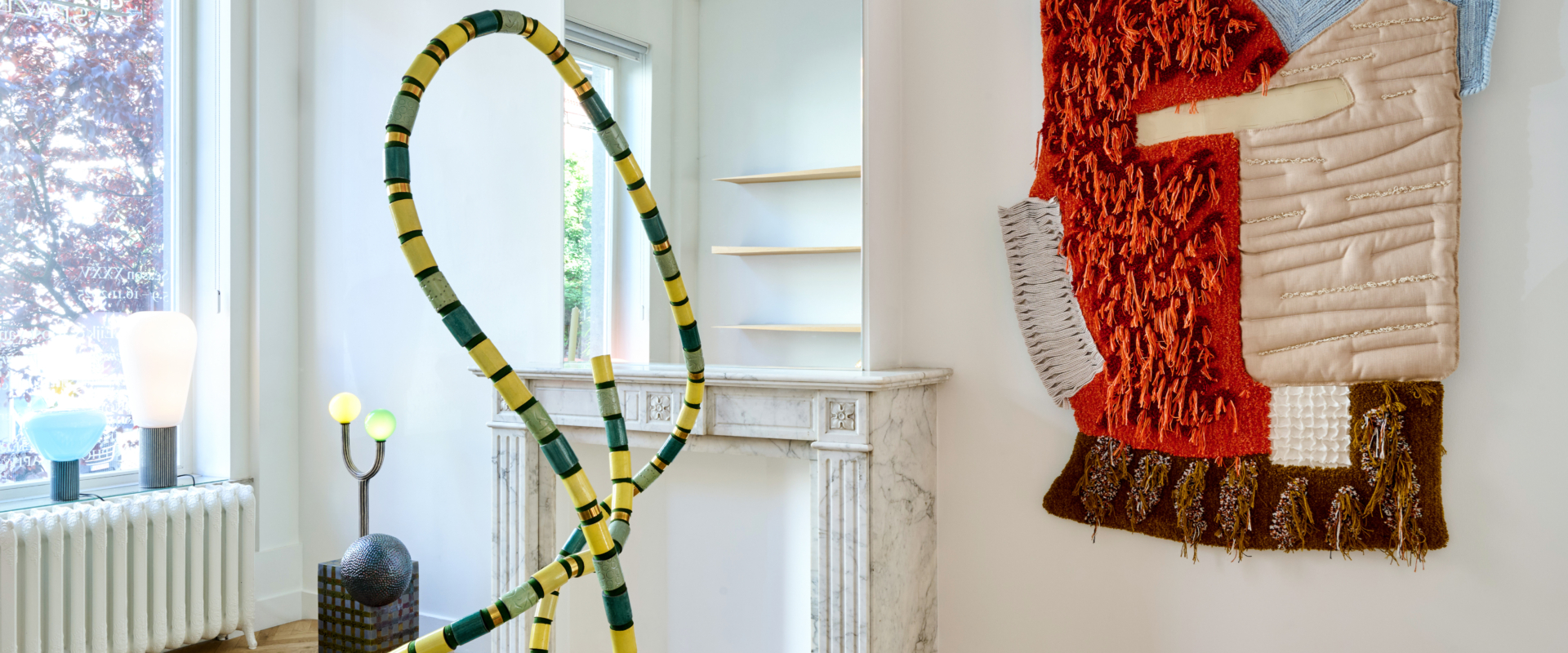 For this exhibition, Kiki and Joost have worked together for the first time to create a cohesive piece: a four-panel room divider composed of hammered copper, cotton lace, vertical cotton roping, and a mirrored surface. This is an object that, while traditionally associated with separation, here becomes a marker of shared authorship and spatial intimacy. There’s a subtle irony in the choice: perhaps only two designers so precisely in tune could choose to materialise their dialogue through an object meant to divide. Yet rather than creating distance, the piece proposes a threshold – inviting reflection, not only in the literal sense of the mirror, but in the way it embodies a synthesis of form languages, techniques, and material affinities. In this single gesture, the structural and the poetic, the precise and the intuitive, merge _ Maria Cristina Didero, Independent Design Curator and Author