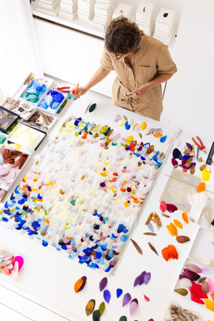 Spazio Nobile is delighted to invite you to an exceptional studio exhibition with Belgian artist Florence Coenraets. This intimate moment offers a rare opportunity to step inside her creative world and explore the feather works that shape her singular language of softness, luminosity, and breath. Entering her studio feels like entering a suspended moment: Florence Coenraets invites us to look more softly and let our senses adjust to nuance, texture, and the quiet vibration of matter. You will discover her most recent compositions up close: Atmosphères mobile sculptures, Immersions and Haikus feather paintings, as well as the Cosmos and Ciel series, which catch light in unexpected ways, where transparency, colour, and layering transform fragility into presence. You will also be able to engage with the artist about her materials, her intuitive process, and the rhythms that guide her daily creation. A studio visit with Florence Coenraets is not only a moment of artistic discovery, but also an immersion into the textures, hues, and subtle movements that animate her evolving visual universe.