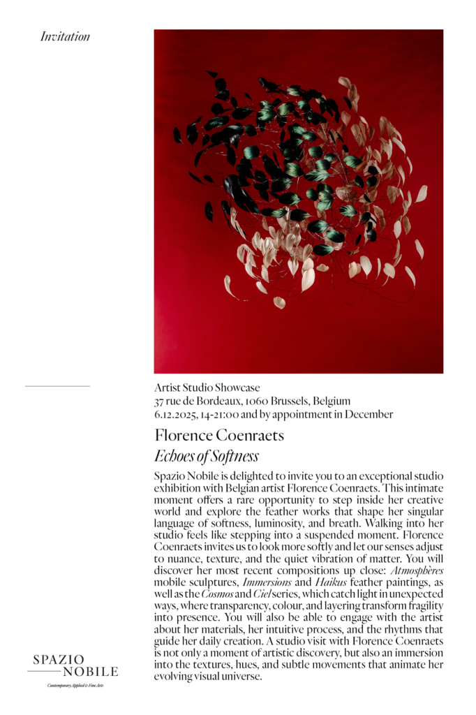 Spazio Nobile is delighted to invite you to an exceptional studio exhibition with Belgian artist Florence Coenraets. This intimate moment offers a rare opportunity to step inside her creative world and explore the feather works that shape her singular language of softness, luminosity, and breath. Walking into her studio feels like stepping into a suspended moment. Florence Coenraets invites us to look more softly and let our senses adjust to nuance, texture, and the quiet vibration of matter.