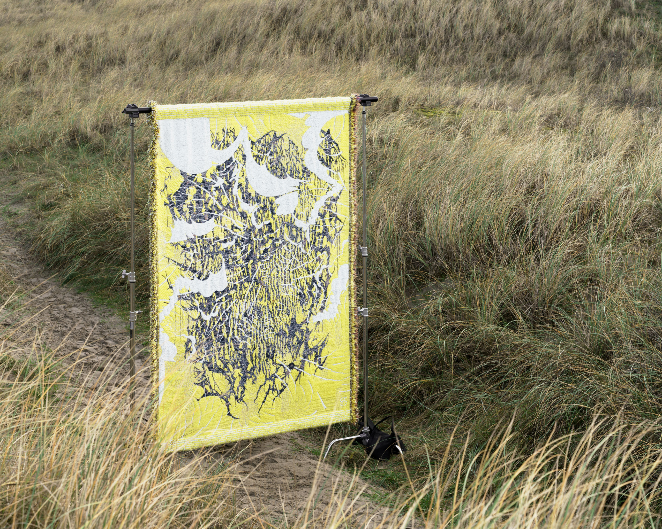 First Symptoms is the new cycle of 6 woven tapestries in size approx 170 x 250 cm, mixed media in silk, mohair, rubberized cotton, cashmere wool, transparent polyester film, velvet, etc. They were first exhibited at the Finnish Institute in Stockholm in February 2019 before moving to Brussels.