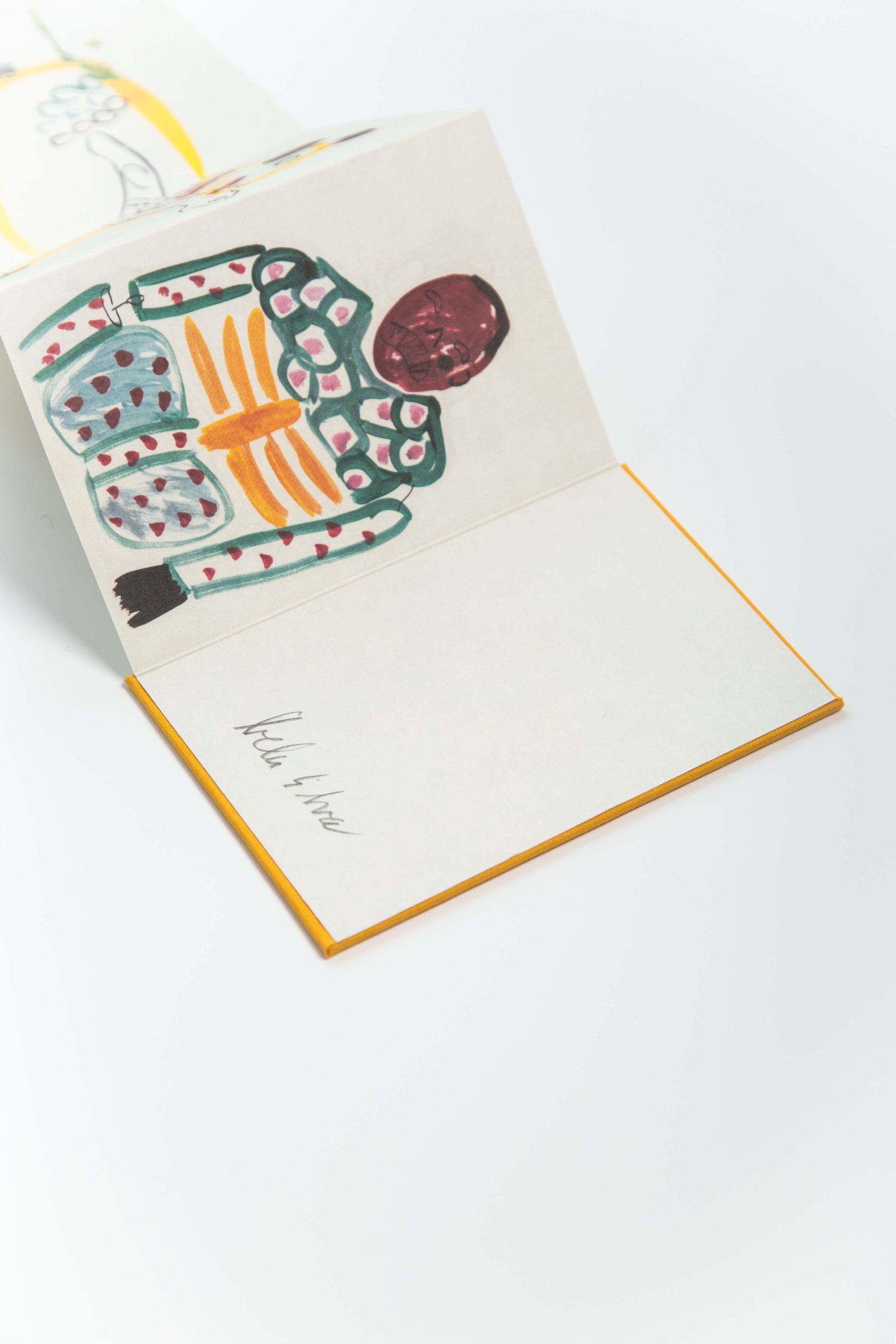 Leporello with colored clothbound front and back and hotfoil printing on the cover