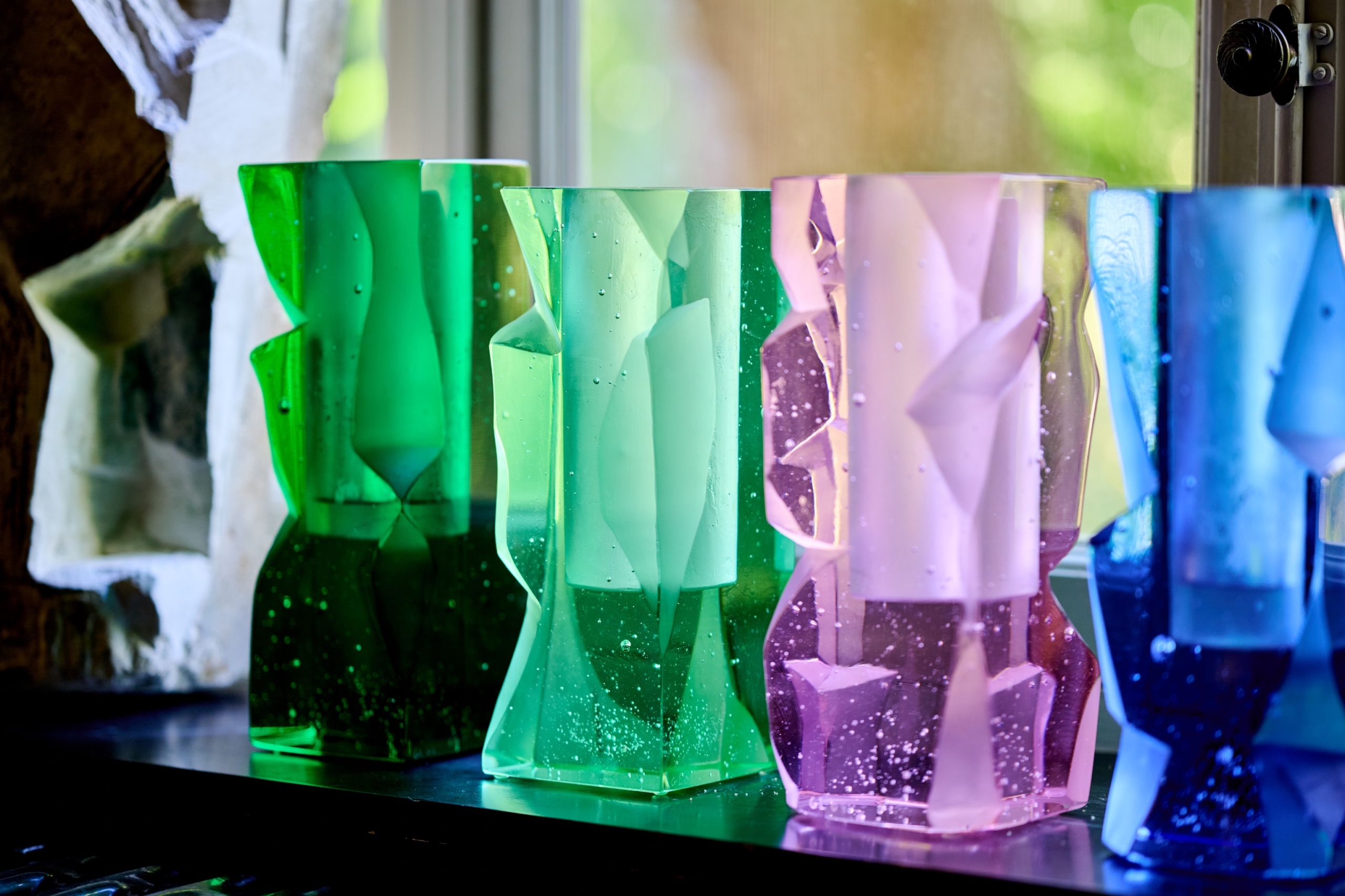 When the kiln is brought up to temperature (800 degrees Celsius /1450- 1530 degrees Fahrenheit), the glass chunks melt and flow down into the mold. The lost wax process is very old and derives from a process for shaping bronze. The original shape is moulded in foundry wax, then covered with clay which becomes an external mould. When everything is annealed, the mould hardens and the wax, by melting, is eliminated through a conical dripping hole made in the covering. The space left free by the ‘lost’ wax is filled in with molten glass, which assume the form of the wax mould. The wax can even be eliminated by evaporation.