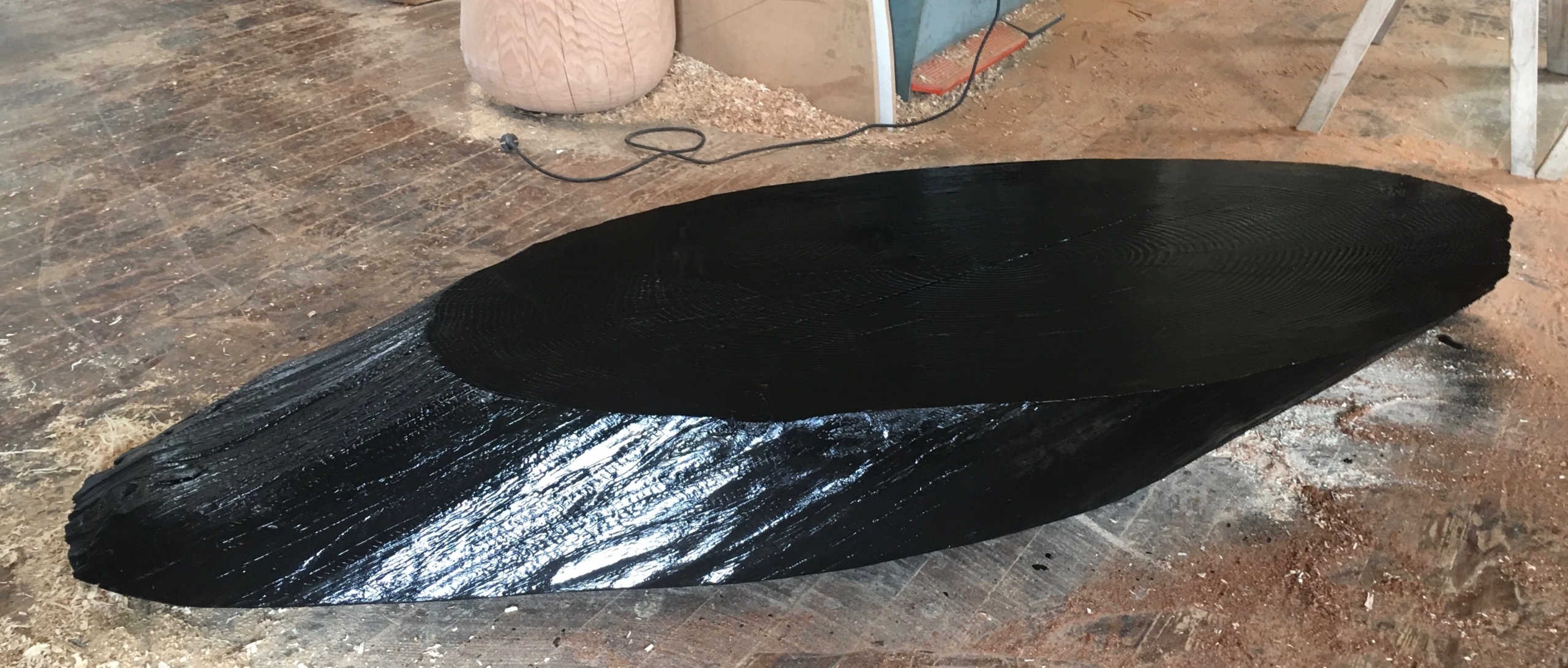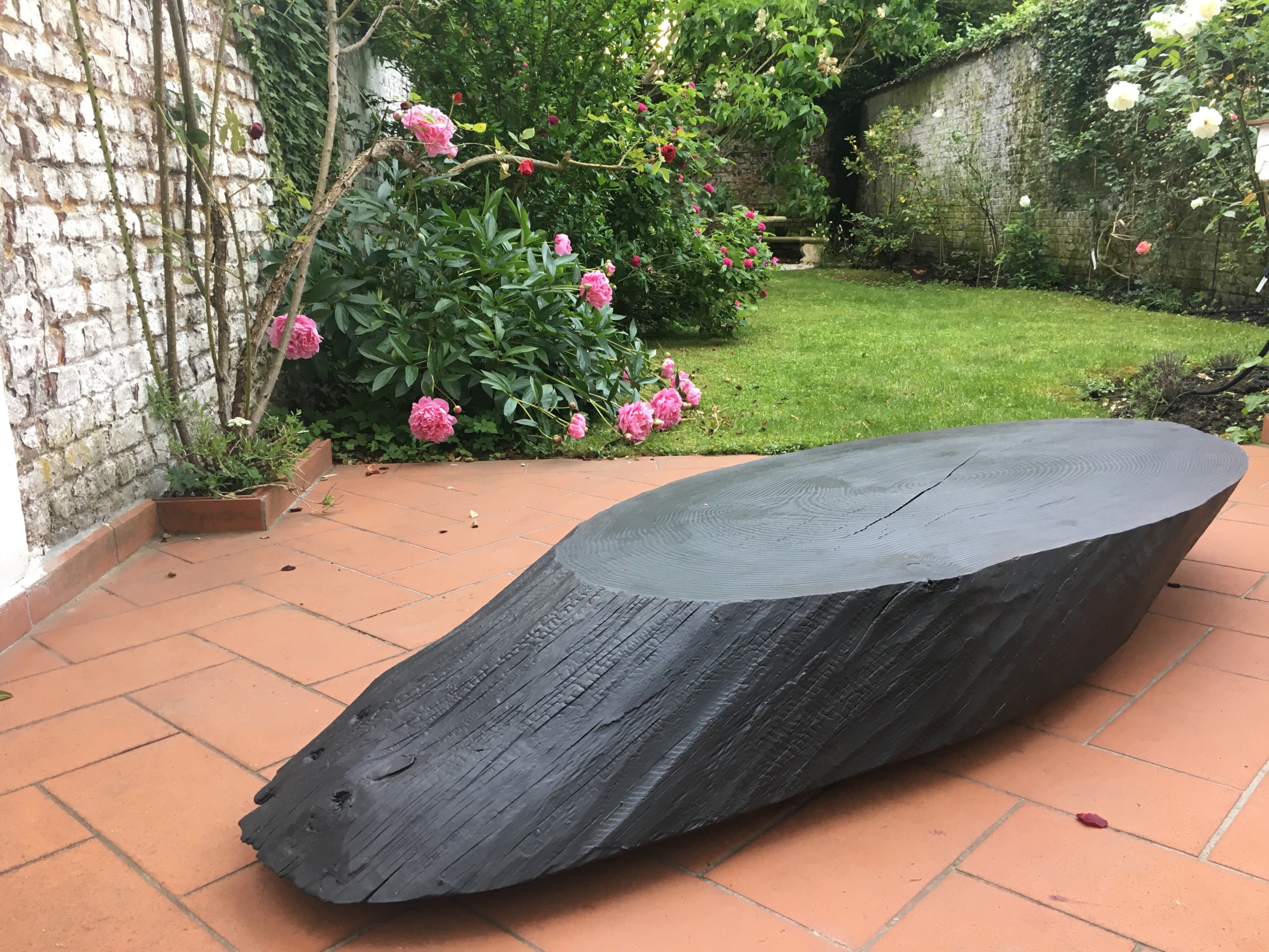 Kaspar Hamacher, 2017, Bench or Low Table in fire sculpted solid Douglas fir : 200 length x 70 width x 25 cm height