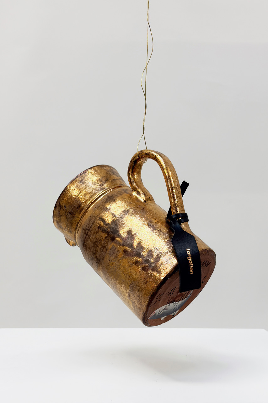 Ceramic jug by Jean Derval for the Le Mûrier workshop, c. 1970, with 10% gold enamel, brass wire and a stamped leather label