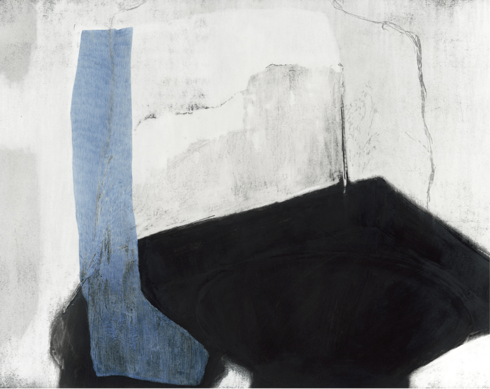 Mixed media, typographic ink, varnish, indigo crayon, sanding on Fabriano paper