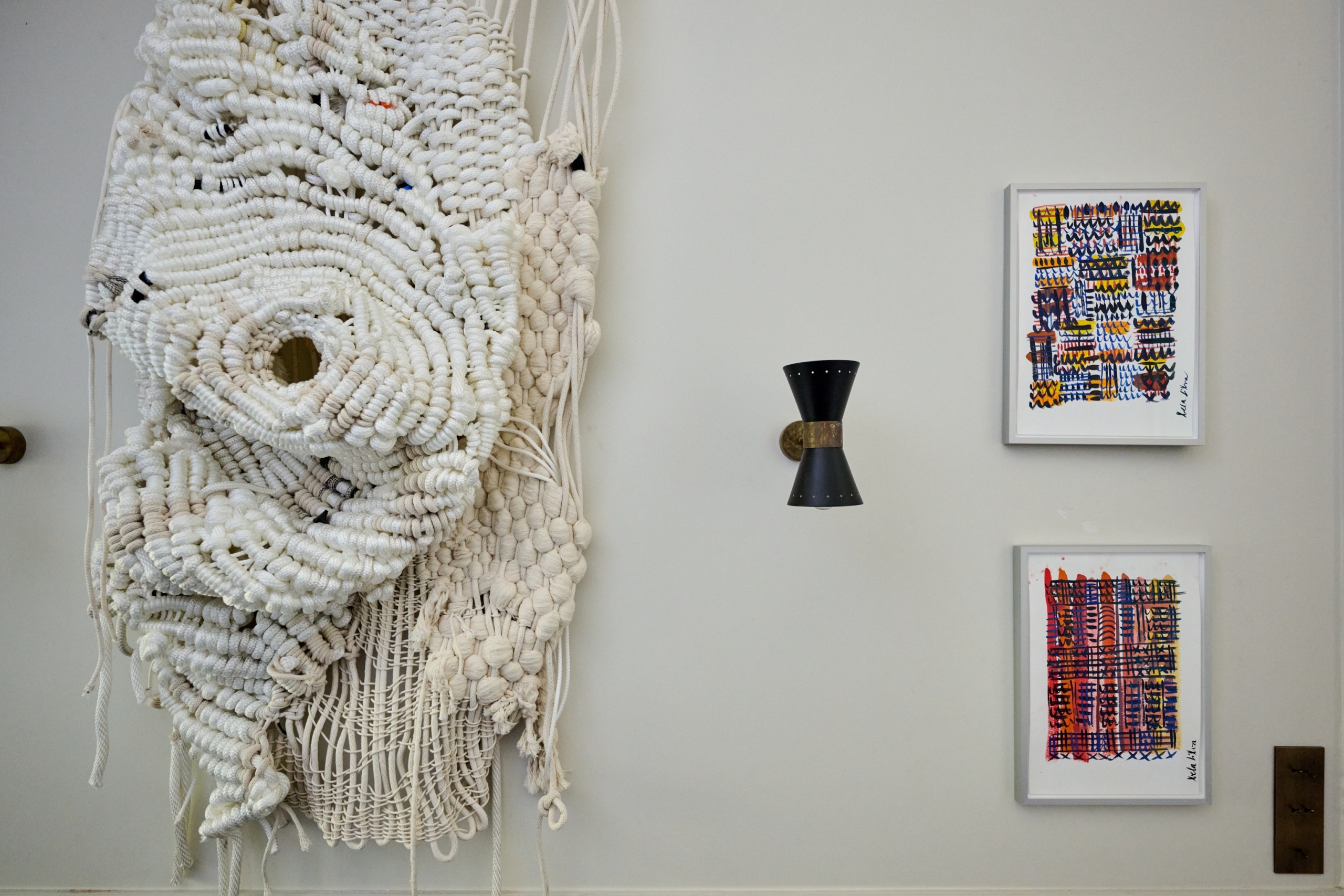 Untitled Series employs cotton cords of varying sizes and consistencies, woven and tied together with distinct rectangular configurations. The suppleness and porousness of the cotton rope is self consciously without form or saturated color – an anti- painting. With these works Surdell reimagines the woven canvas as a space of undulation and growth — employing my body as a weaving shuttle, and my hand as brushstroke.