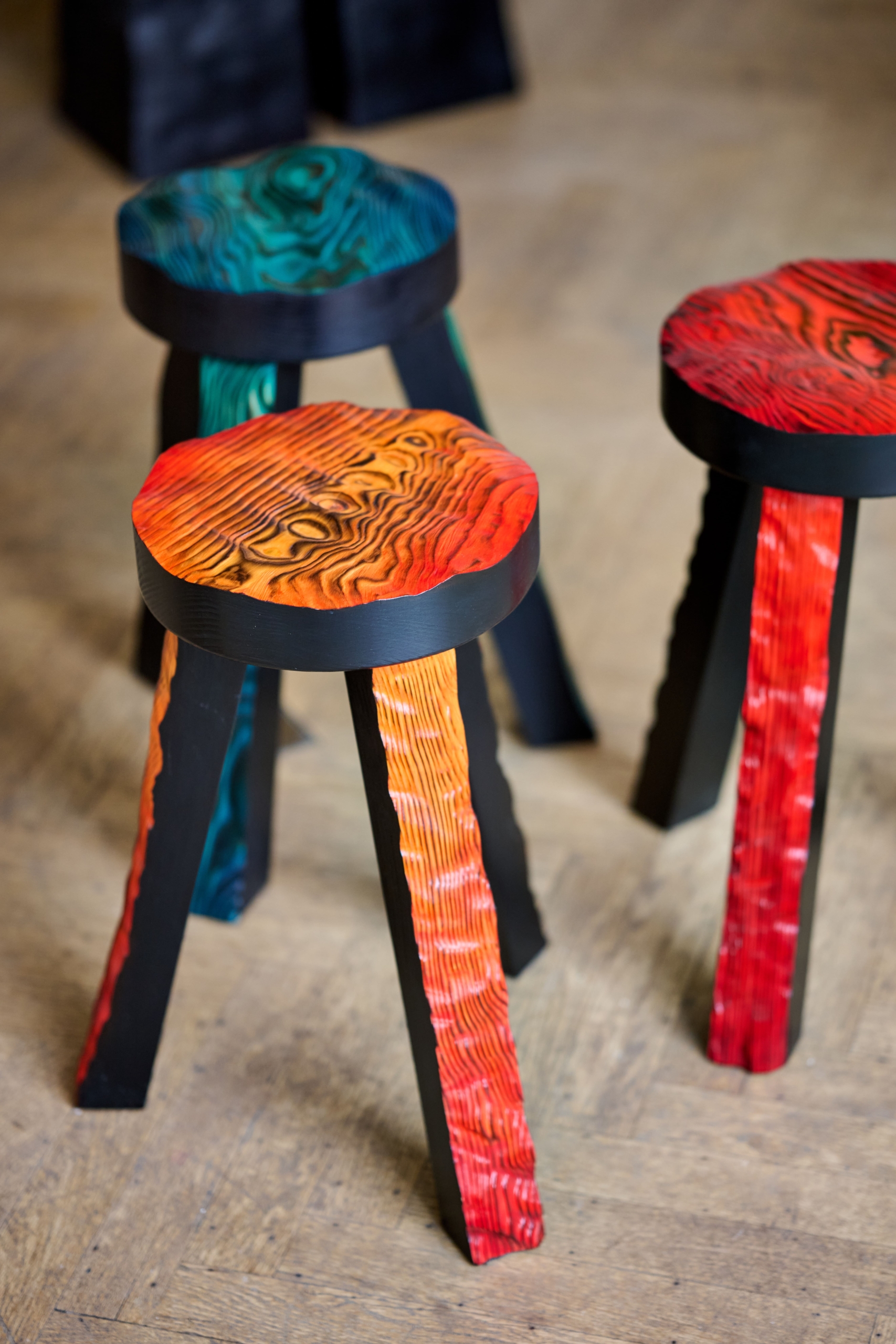 Spruce wood, brushed, carved, sculpted, ink-dyed, and finished with lacquer